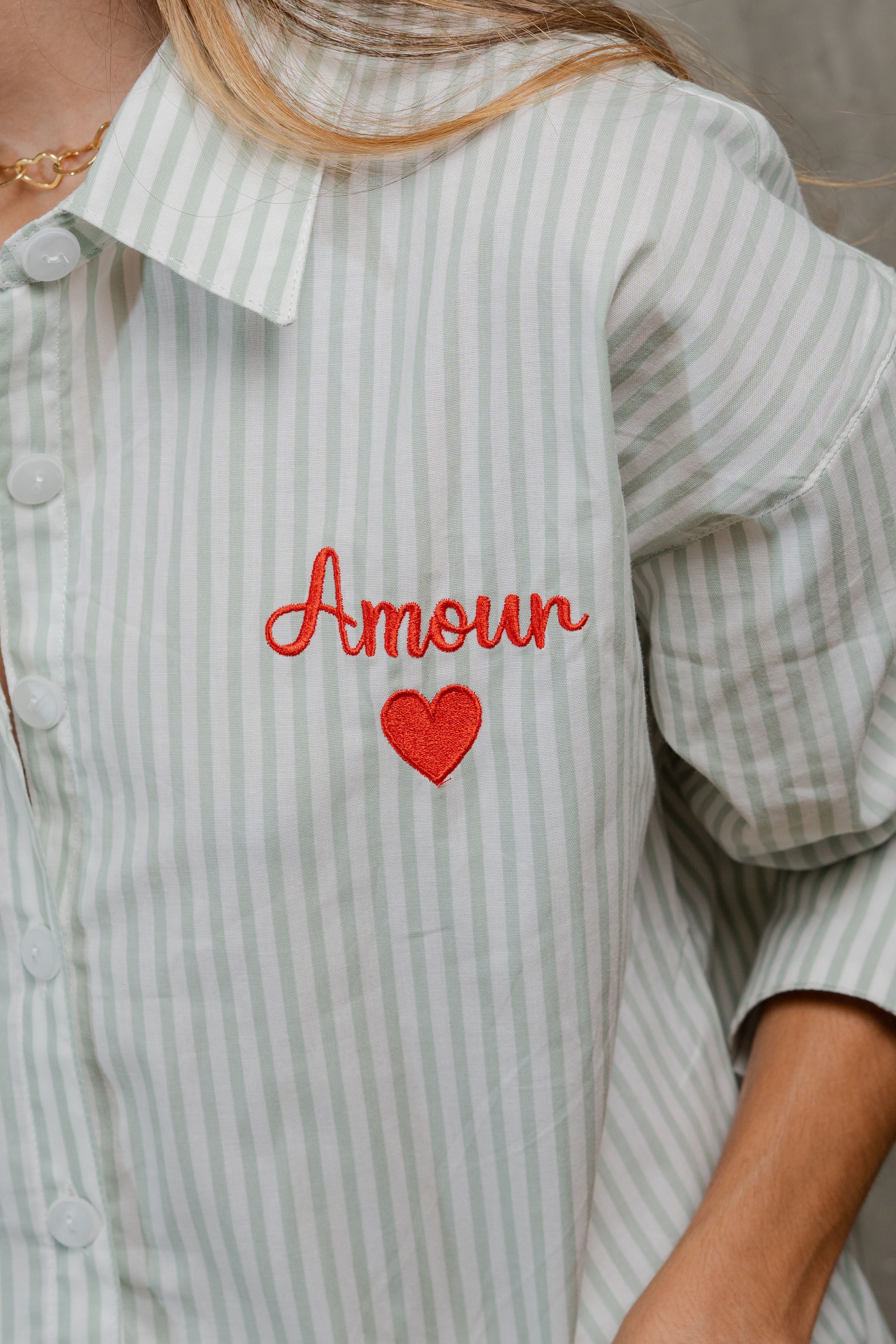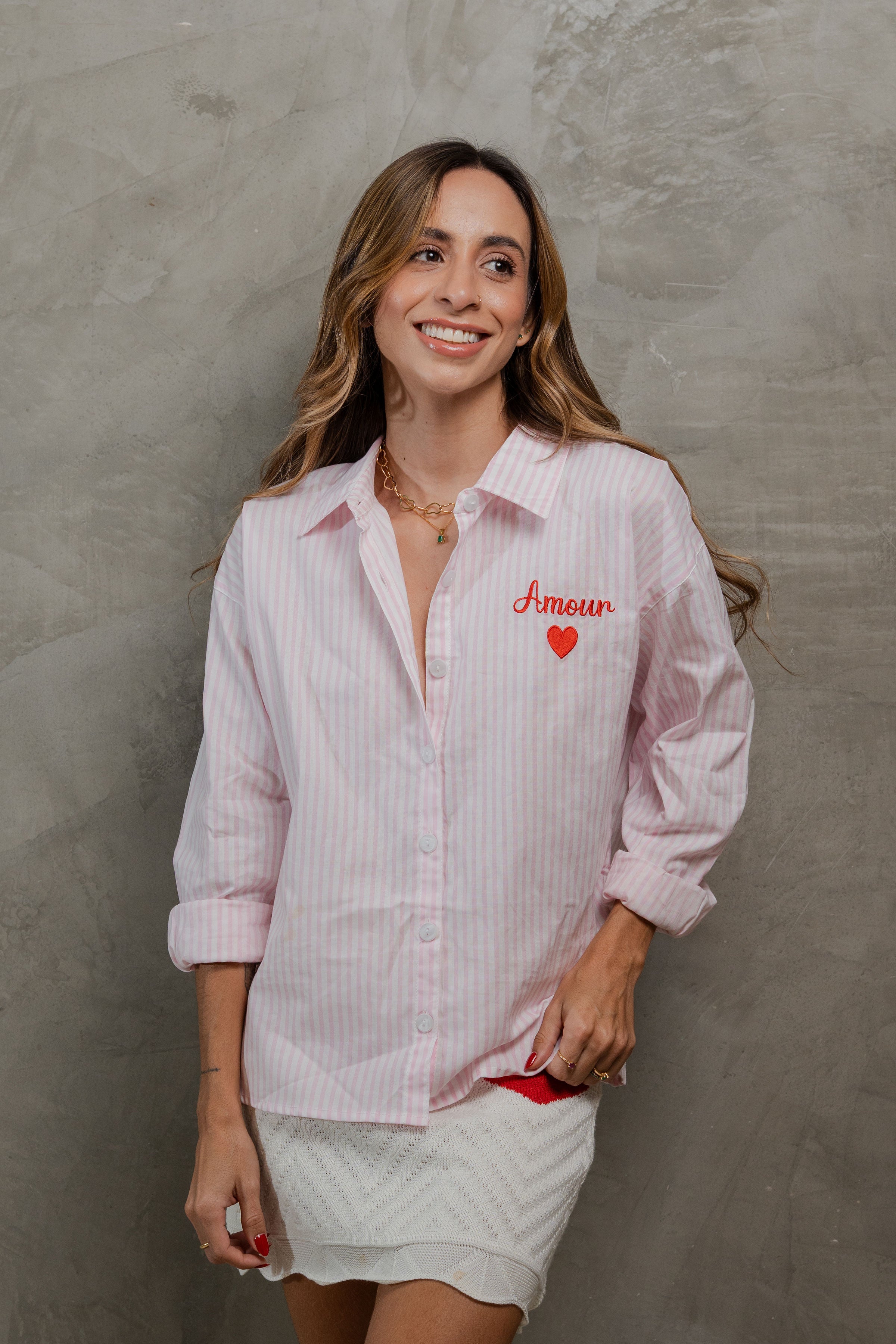 Nuestra camisa Amour combina elegancia y frescura con un toque romántico. Su diseño versátil permite usarla por dentro o fuera del pantalón o falda, adaptándose a looks casuales o más arreglados. Perfecta para quienes buscan un outfit delicado, moderno y con un mensaje sutil de amor propio.